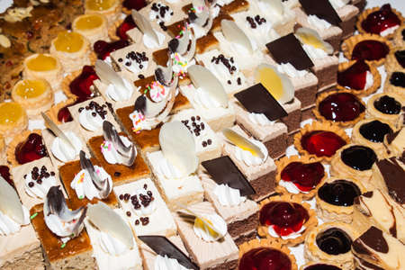 many kind of little pastries with cream, chocolate and fruit. bakery concept.
