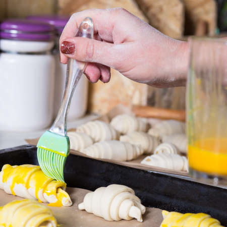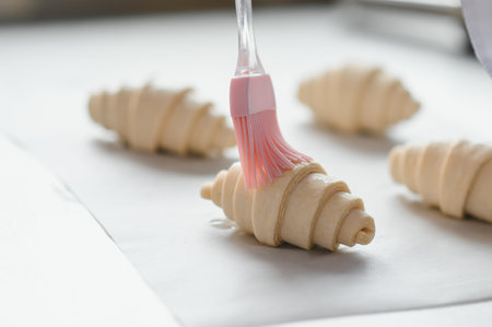 Using Pastry brush for brushing raw croissants, on metal tray with baking paper.