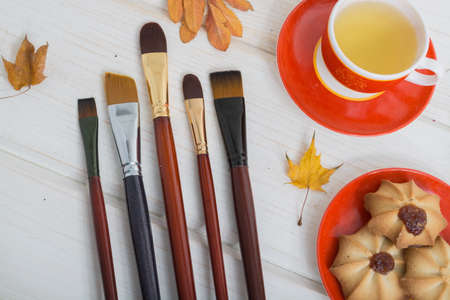 red cup of tea, brushes for make up (drawing), cookies decorate autumn leaves on white wood backgraund.