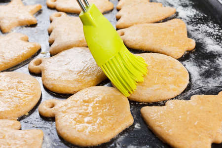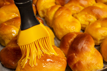 Closeup on smearing buns with egg yolk with pink kitchen brush