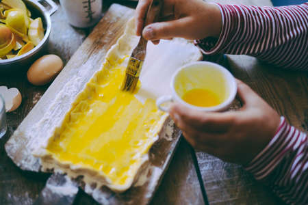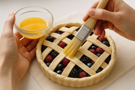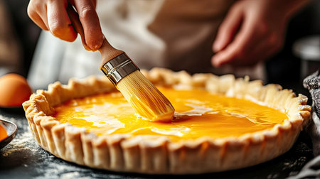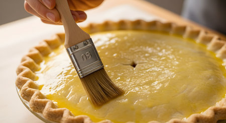A warm and inviting scene showcasing a hand brushing egg wash onto a pastry crust, perfect for a delicious pie preparation in a cozy kitchen.