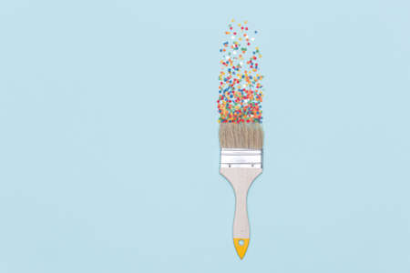 Colorful confetti splashing from paintbrush on blue background. Party, celebration, Christmas concept.