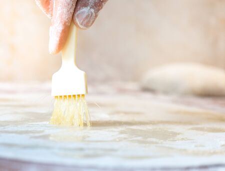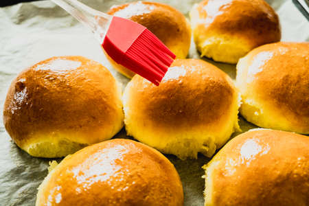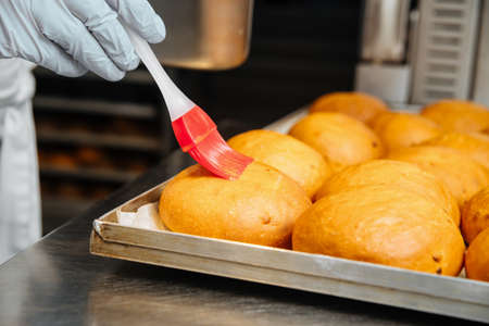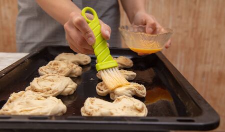 The baker greases the buns before placing them in the oven. Home baking and confectionery production. Home cooking concept. Vertical photo