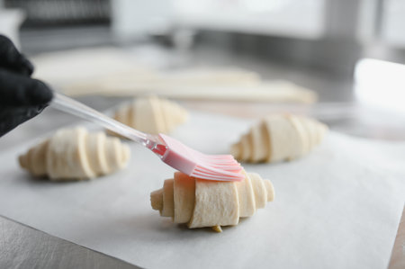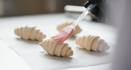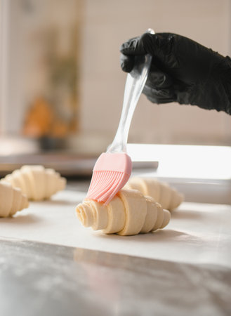Close-up of baker brushing egg wash onto raw croissants, preparing pastries in professional kitchen