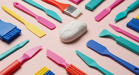 Overhead view of various colorful modeling tools and a lump of white clay. The tools are in different shades of pink, blue, yellow, and orange, arranged in a grid pattern on a light pink surface. The clay is centrally located. The image is ideal for commercial and editorial uses showcasing art, crafting, and creativity tools.