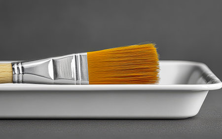 A paintbrush with vibrant yellow bristles is positioned in a white tray.