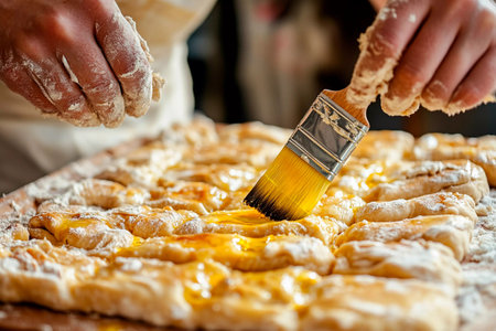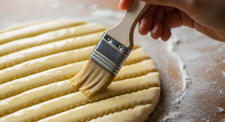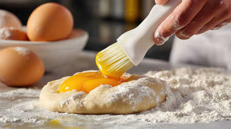 In a cozy kitchen, a baker applies an egg wash to freshly prepared pastry dough, with flour dusting the surface and hands. Warm light creates a welcoming ambiance.