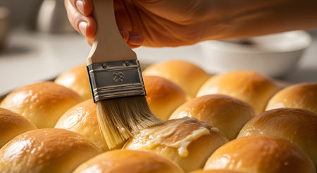 A close-up shot captures a hand using a brush to apply melted butter or egg wash onto freshly baked, golden-brown dinner rolls. The warm lighting emphasizes the soft texture and appetizing shine of the homemade bread.