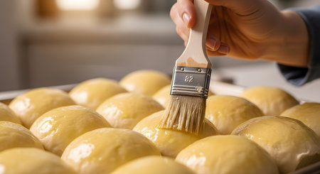 A focused shot of a pastry chef brushing egg yolk onto uncooked bread dough with a silicone brush, set in a modern kitchen.