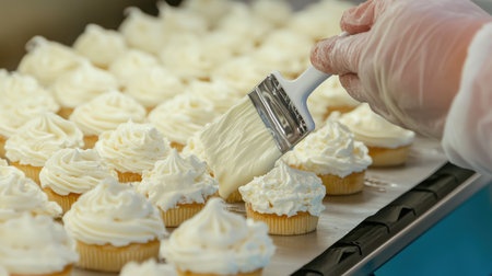 A skilled baker carefully applies rich creamy frosting to freshly baked cupcakes, showcasing a meticulous attention to detail in a vibrant bakery setting.