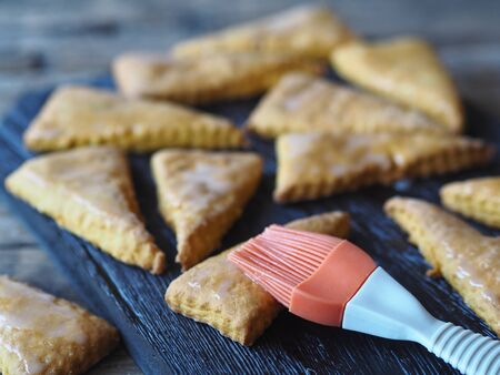 Side view. Skon homemade sandwich pumpkin cookies, with glaze brush, on a dark kitchen board on a wooden ancient background.