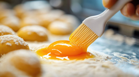 Close-up of a pastry chef brushing golden egg yolk onto raw bread dough with a silicone brush in a bakery kitchen.