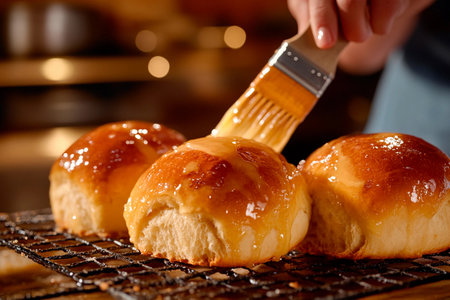 Warm, freshly baked rolls glisten under a layer of golden syrup as a hand expertly brushes them on a cooling rack. The cozy kitchen atmosphere radiates comfort and deliciousness.