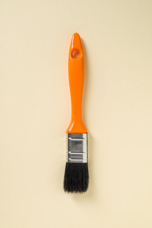 Yellow paint brush on a yellow wall with hard shadow and sunlight.