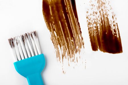 Brush and strokes of chocolate syrup on white background. Confectionary art and cake decoration.