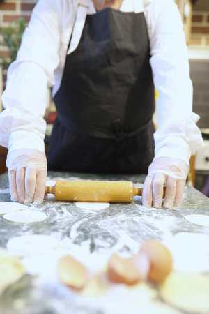 Ingredients for baking - flour, wooden spoon, rolling pin, eggs. Woman hands kneading fresh dough