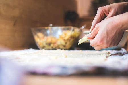 Female hands sprinkle powdered sugar on apple puffs. Process of cooking close up. Selective focus.