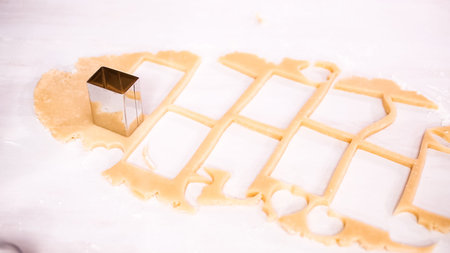 Step by step. Cutting out shapes from sugar cookie dough with cookie cutters.