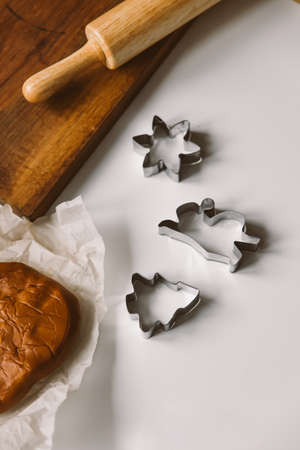 Raw dough and cutters for the holiday cookies on table. Preparing Christmas gingerbread cookies. Steps of making biscuits. Top view.