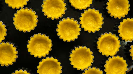 Top view of making process egg tart in a mold on a black tray. It is a kind of custard tart of an outer pastry crust filled with egg custard. Pattern arranged neatly. Selective focus.