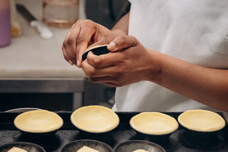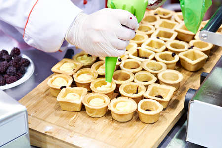 Caucasian pastry chef woman making tarts at cozy kitchen