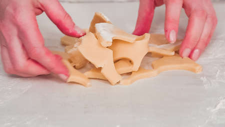 The confectioner forms gingerbread cookies using an original rectangular cutting. Womans hands in protective gloves. Rolled out dough. Stencils in the form of special shapes