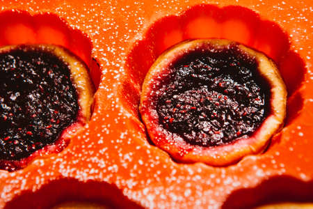 Baking tray with fresh berry pastries. Top view.