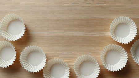 A collection of round white cupcake liners arranged in a circular pattern on a wooden surface, perfect for baking enthusiasts and food presentation ideas.