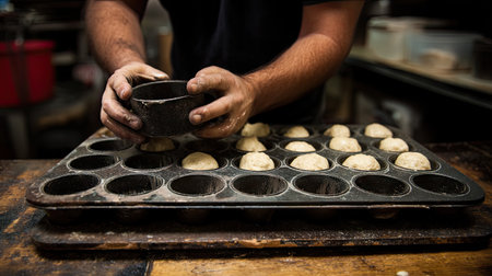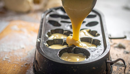 A baker carefully pours golden, smooth batter into a specialty baking mold, the first step in creating delicious, homemade pastries.
