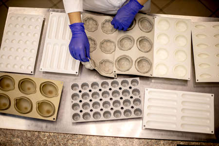 Professional female baker wearing gloves and black apron spraying golden edible glitter onto mini dessert chocolate tarts. Baking process. Decorating. Horizontal indoor close-up shot. High quality photo