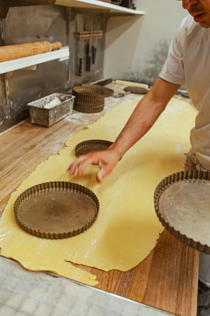 Traditional European bakery kitchen, patissier making pastry pie round shape base, with non-stick quiche pastry tin