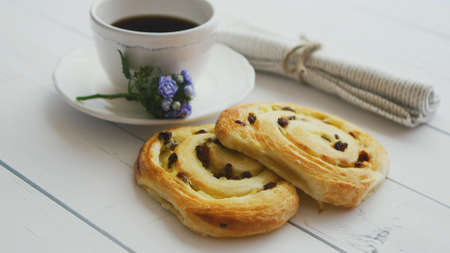 Delicious pastry rolls of snails with raisins and a cup of black coffee. Side view. Composition on white wooden table.