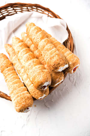 puff cream rolls or Pastry served over moody background. selective focus