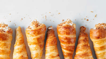 Puff pastry horns filled with Italian meringue, Schaumrollen or Cream Horns on white background, copy space, top view, flatlay, no people.