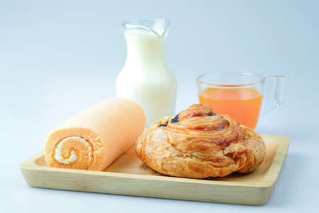Breakfast including milk, danish pastry, orange juice and sweet rolls cake.