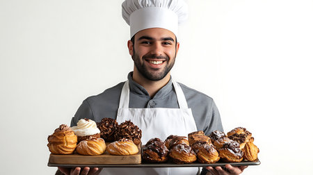 A smiling man wearing a chef's hat is holding a tray of pastries. The pastries are arranged in a way that they look fresh and appetizing