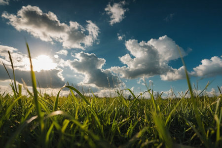 Macro photography of green grass from ground perspective with shallow depth of field. Blurred cloudy sky background. Natural outdoor scene with fresh vegetation and soft focus. Low angle nature view.