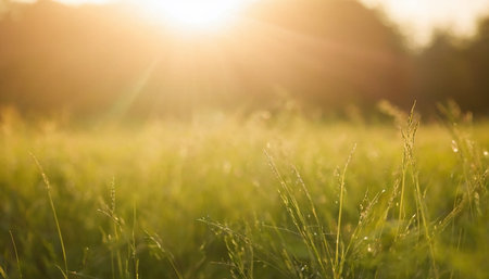 Green nature field grass with dew drops of bokeh in the morning,blurred background