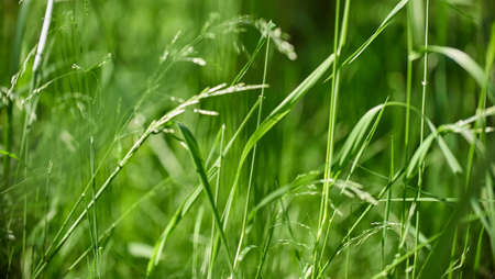 Creative background image of blurry green blades of grass. Copy space. Selective focus