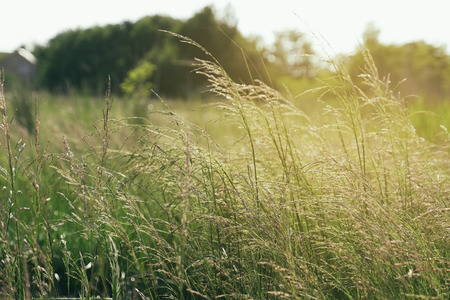 Wild grasses in summer meadow. Grasslands in evening countryside. Floral wallpaper. Grass and herbs close up in evening sunshine, atmospheric image