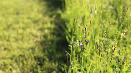 Green spring grass in sunlight horizontal abstract blurred background in sunny summer day in park