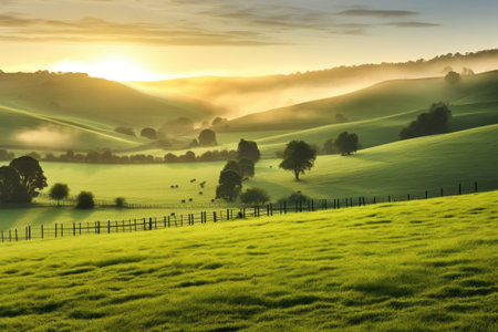 a soft-hued sunrise over rolling green hills, created with generative ai