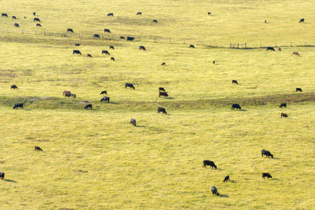 the pasture, viewed from above, stretches out in a serene landscape, showcasing a flat, duotone color scheme, evoking a sense of rural tranquility, with rolling hills, lush green grass, and scattered trees, perfect for grazing livestock, and capturing the essence of countryside living, rural landscapes, and agricultural scenery. ai generated