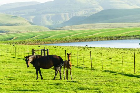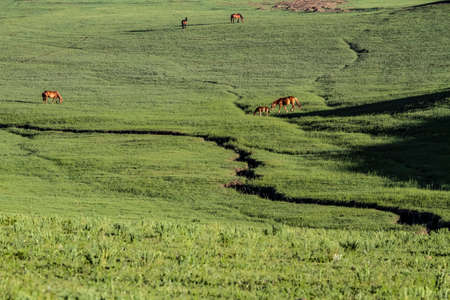 Generative AI : Green pastures with horses grazing in the mountains of Leon Spain