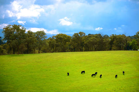 Cows pasture in green valey. Wide angle, long distance perspective in sunny day. Horizontal full frame crop
