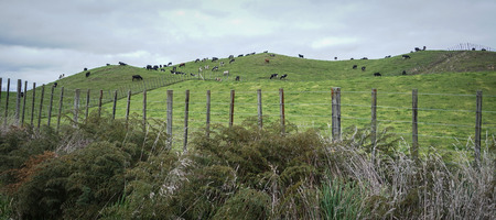 Stunning scene Cloudy and blue sky with green grassland. New Zealand agriculture in the rural area.