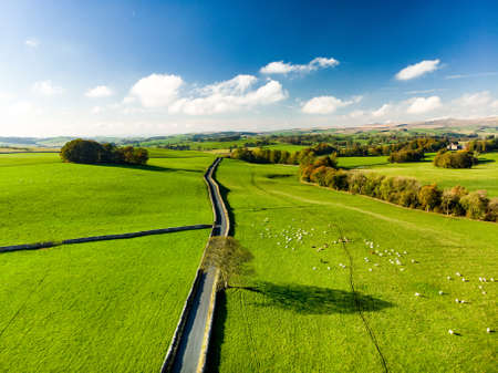 Aerial view of endless lush pastures and farmlands of England. Beautiful English countryside with emerald green fields and meadows. Rural landscape on sunset.