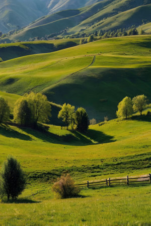 Lush green hills create a serene pastoral scene with trees and wooden fence adding detail Great for nature travel content.