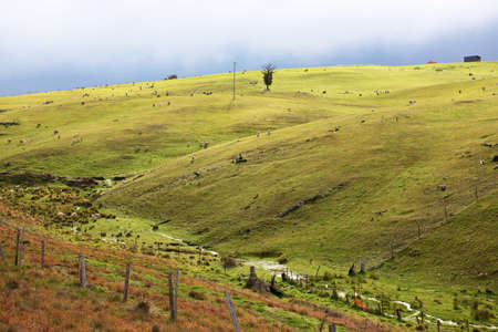 Rural area full of green hills and sheep on a sunny day. New Zealand