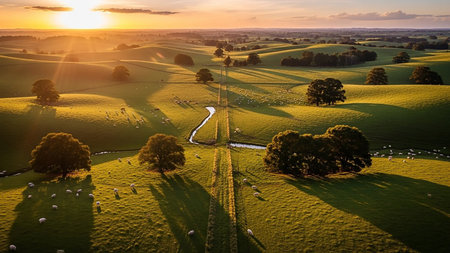 An aerial panorama showcases rolling green hills with scattered sheep and trees, a winding stream, and warm sunset light creating long, dramatic shadows across the...